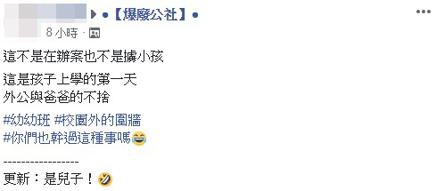 一名女網友表示,這天是孩子上學的第一天,但是爸爸和外公卻覺得非常捨不得,結果2人就這一在圍牆邊不停往學校內盯著看,甚至還一手試著擋住陽光探頭探腦,就希望可以捕捉到孩子的身影。
