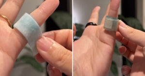 在調整完膚色跟眉毛後,大媽的五官已經變得十分立體。但下一秒大媽拿出「神奇膠帶」往臉上一貼,臉型瞬間被修飾成古典美女的鵝蛋臉。上完唇彩後,大媽的大鋼牙竟然瞬間消失,被修飾成櫻桃小嘴。