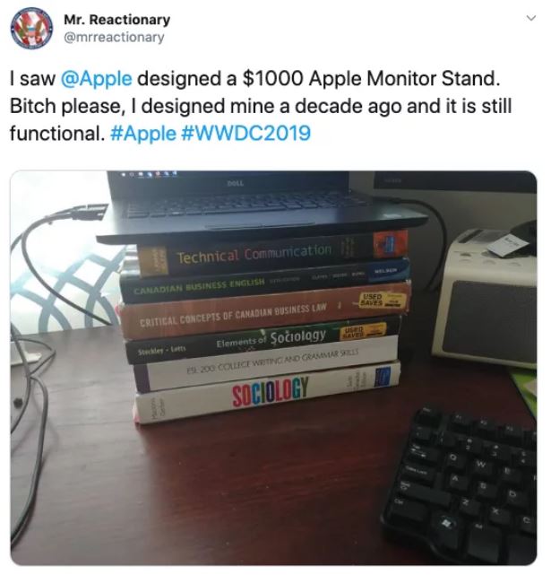 有許多網友發表了自己對於這3萬元支架的想法,這位表示:「我看到蘋果設計出了一款1000美金的螢幕支架,拜託X子,我N年前就已經發明出來了,而且它現在還能用呢!」
