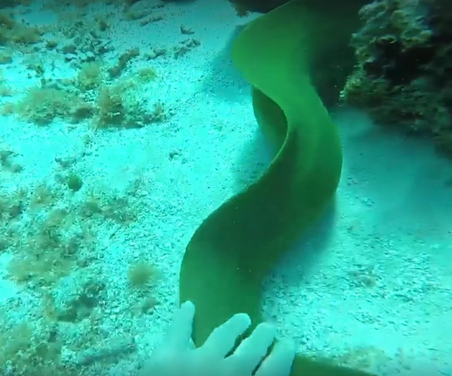 這位潛水客日前在海底發現了海鰻,雖然海鰻生性害羞不太會主動.攻.擊人類,但如果不小心被牠們咬.到可不是鬧著玩的。但這位潛水客卻很大膽,看到海鰻鑽進礁岩裡,尾巴在尾巴搖啊搖的,於是決定上手摸個幾下。