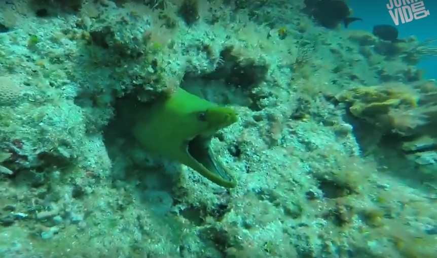 轉頭一看,發現海鰻張著「超凶猛大嘴」!他當下就把嚇到,發出了「少女式尖叫」馬上游回海面。雖然小編早知道這個結局,但親眼看到這個畫面還是覺得很震撼。大家真的千萬不要調皮,畢竟生物們的脾氣,我們無法預測啊……