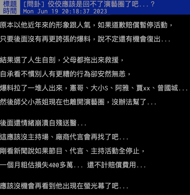 PO直言,黃子佼事後還情緒崩潰、自殘送醫,「這應該沒主持場、廠商代言會再找了吧?剛看新聞說如果節目、代言、主持活動全停止,1個月粗估損失400多萬,還不計賠償費用,應該沒機會再看到他出現在螢光幕了吧?」