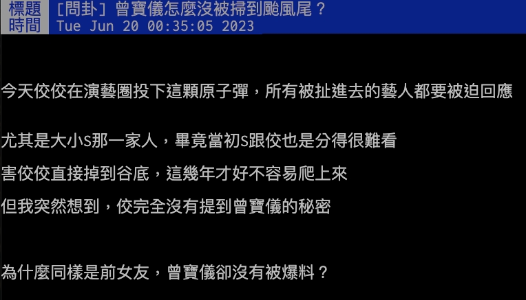 日前黃子佼坦承性騷擾,在臉書上傳道歉影片,同時狂爆數名藝人好友的黑料,包括大小S、夏宇童、「陶」姓與「賈」姓女藝人等,唯獨沒提到前女友曾寶儀。對此,一名網友在PTT以「曾寶儀怎麼沒被掃到颱風尾?」為題,分享自己的疑問。