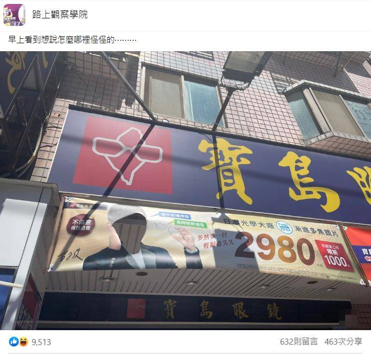 一位網友在臉書社團《路上觀察學院》曬出路上一間寶島眼鏡行的照片:「早上看到想說怎麼哪裡怪怪的……」原本掛在招牌下的布條似乎破了一個大洞,仔細看才發現是代言人的臉部照片被完整裁切掉,剩下透明人幫忙打廣告。