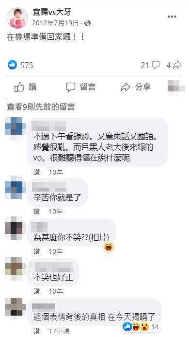 隔天2012年7月19日,大牙也在自己的臉書發了獨照:「在機場準備回家囉!!」前一天和黑人的合照大牙開心燦笑,回國時的獨照是沒有笑容嘟著嘴。10年前就有網友關心:「為什麼你不笑? (相片) 」、「不笑也好正」。