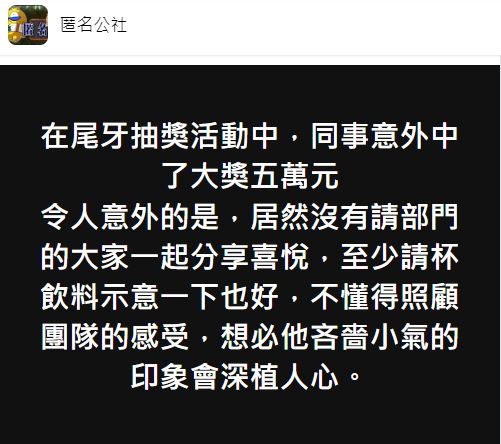 一名網友在臉書社團《匿名公社》上發文抱怨,表示同事在尾牙抽中5萬元現金大獎,對方卻沒有和部門一同分享喜悅,「至少請杯飲料示意一下也好」,怒批當事人小氣又吝嗇,不懂得照顧團隊的感受。
