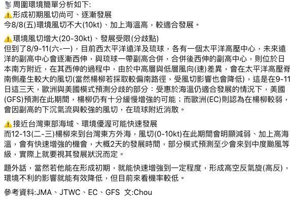 「觀氣象看天氣」分析,周圍環境簡單分析如下,颱風「楊柳」形成初期,風切尚可、逐漸發展,今 (8) 日環境風切不大 (10kt) 、加上海溫高,較適合發展,但到了週六與下週一,目前西太平洋遠洋及琉球,各有一個太平洋高壓中心,未來遠洋的副高中心會逐漸西伸,與琉球一帶副高合併,合併後西伸的副高中心,位於日本南方附近。