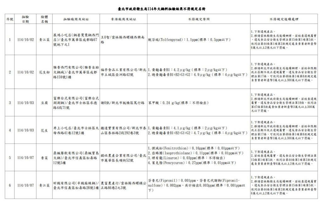 台北市衛生局公布114年火鍋料抽驗結果,3件蔬菜 (青江菜2件、香菜1件) 檢出農藥殘留,不符「農藥殘留容許量標準」;2件花生粉檢出黃麴毒素,不符「食品中污染物質及毒素衛生標準」第4條食品中之真菌毒素限量;1件豆腐類產品檢出防腐劑苯甲酸,不符「食品添加物使用範圍及限量暨規格標準」。