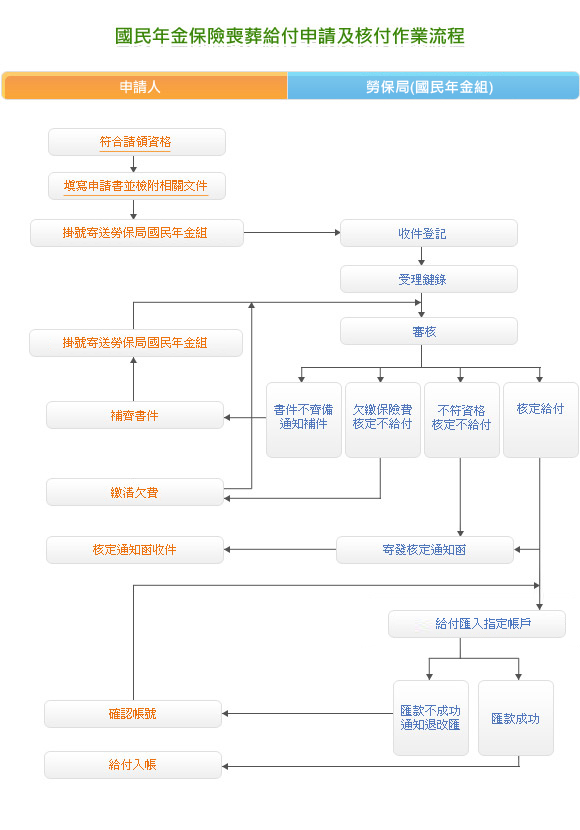 請領資格是被保險人於參加國民年金保險期間 (65歲前) 死亡時,可由支出殯葬費的人請領喪葬給付,原則上以1人請領為限。申請後不需要再跑一趟勞保局,給付會直接匯到申請人的帳戶。請領日是被保險人死亡次日起算,5年內必須儘速申請,超過5年就不能再申請了。