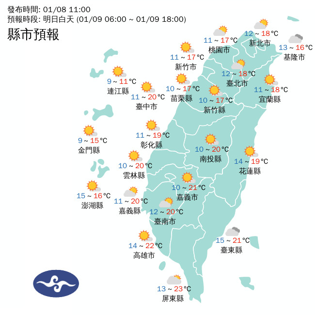 冷氣團一波接一波!氣象署說明,週六晚上到下週一清晨 (10~12) 還有新一波冷氣團南下,北部及東北部天氣偏冷,其他地區早晚亦冷;基隆北海岸、北部山區、東半部地區及恆春半島有零星短暫雨,其他地區為多雲到晴。直到下週一白天北部及東北部氣溫才會回升,不過全台各地早晚一樣偏冷,西半部日夜溫差大。