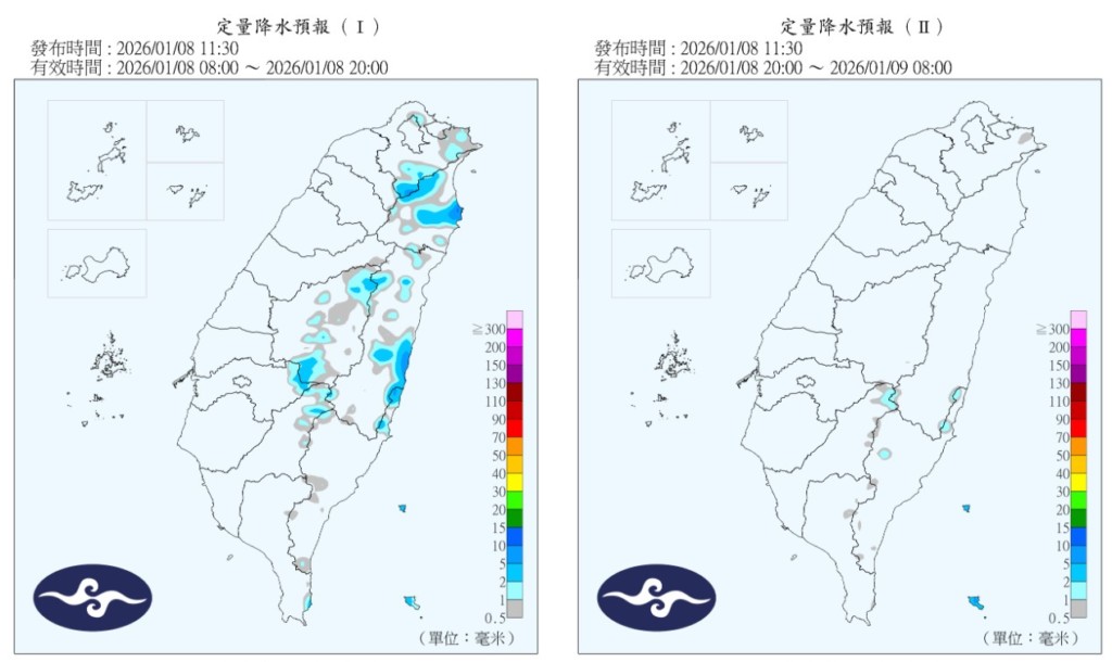降雨部分,今天 (8) 基隆北海岸、大台北山區及東北部地區有局部短暫雨,桃園以北、東部、東南部地區、其他山區及恆春半島有零星短暫雨,其他地區為多雲到晴。明後天 (9、10) 各地大多為多雲到晴,僅東半部地區及恆春半島有零星短暫雨;週六 (10) 白天基隆北海岸、北部山區亦有零星短暫雨。