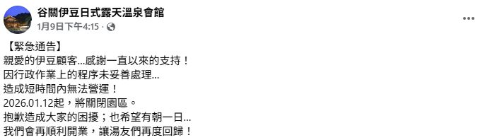 谷關伊豆日式露天溫泉會館在社群粉專發文公告,「因行政作業上的程序未妥善處理,造成短時間內無法營運!2026.01.12起,將關閉園區」。消息一出許多消費者急忙詢問已購買泡湯券事宜,業者強調皆可至現場櫃台退票,日後再開業也能繼續使用。