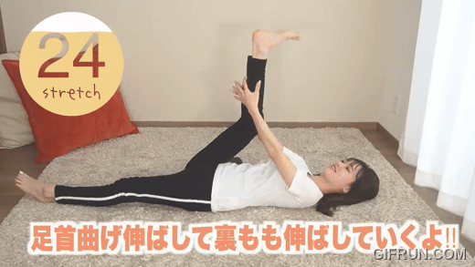 平躺後抬起單腳,腳掌在勾腳與伸直之間來回切換。能促進腿部血液迴流,小腿做完會明顯覺得輕,對晚上抽筋也有幫助。
