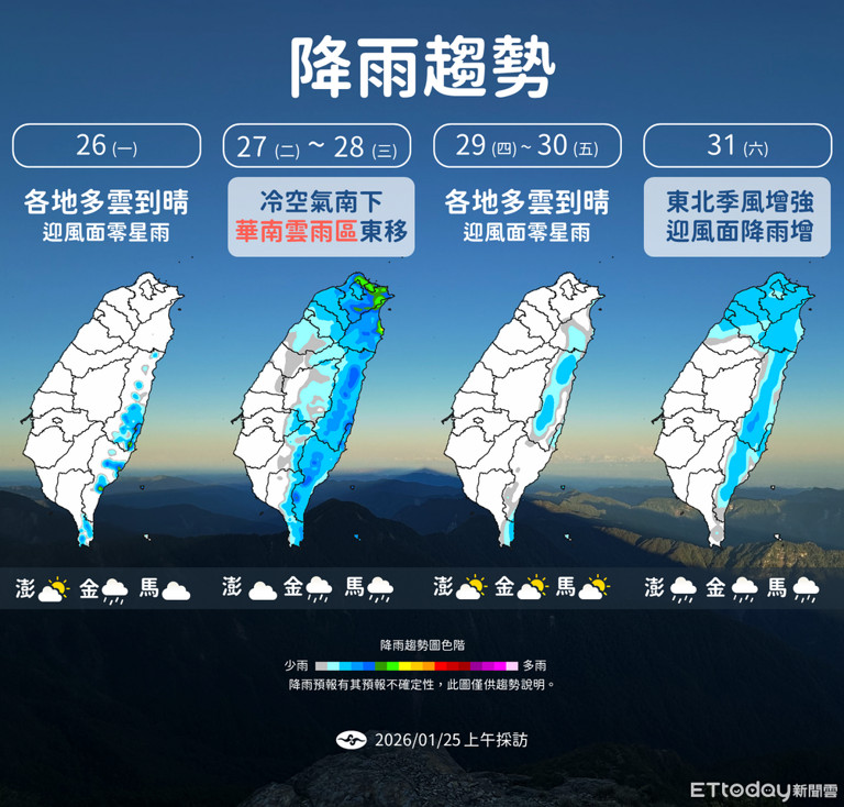周四 (29) 到周六 (31) 各地将转晴时多云,全台气温逐日回升,仅东半部偶有局部短暂阵雨,不过很快周六晚间又有一波冷空气南下,北部云量增多、东半部转有局部雨,北台湾体感上偏凉微冷。一直要到下周二 (2/3) 起冷空气逐日减弱,各地天气才会转晴朗稳定、回温,但因辐射冷却影响,还是得留意日夜温差大。