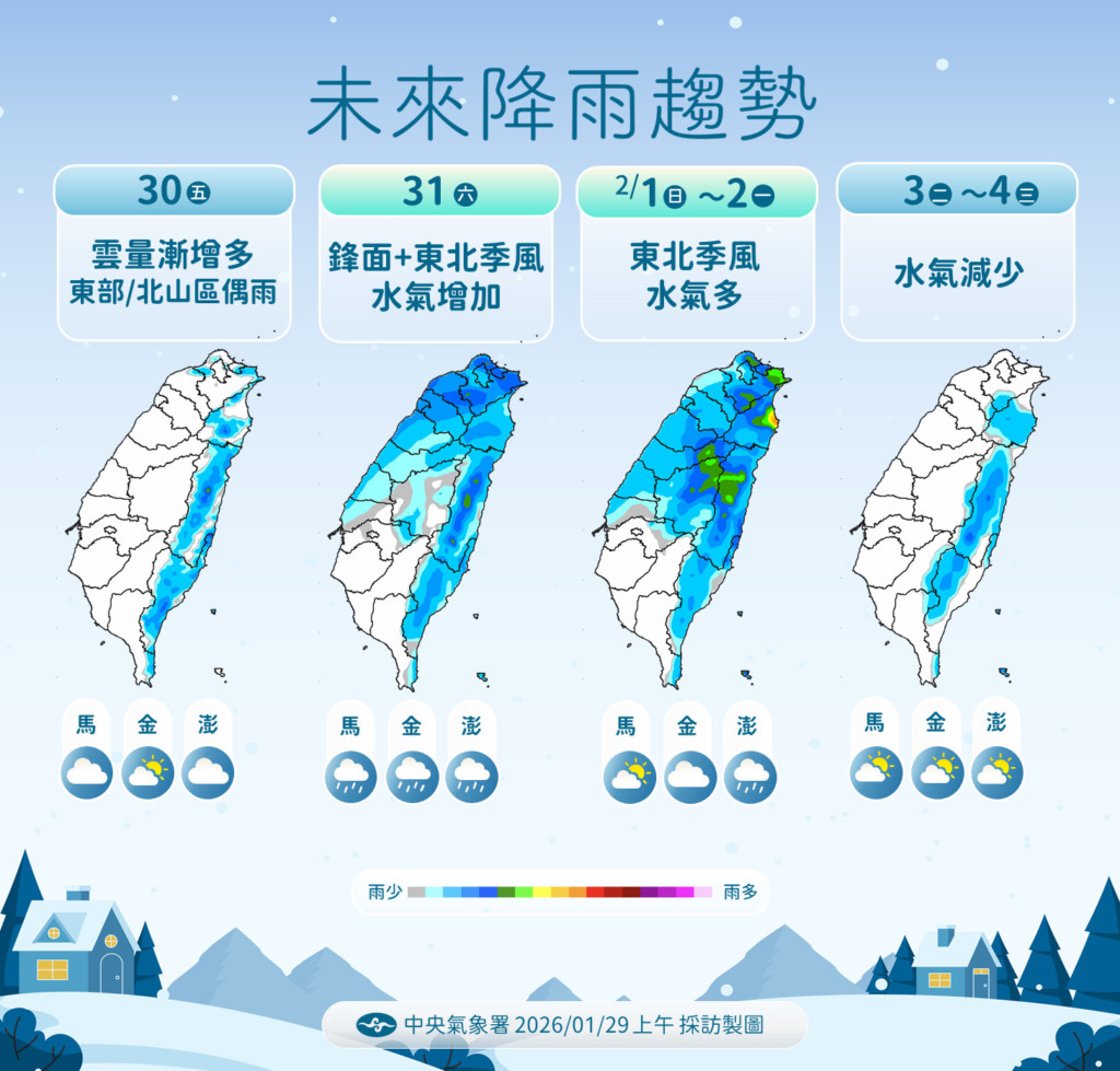 根據媒體《TVBS》、《中時新聞網》的報導,中央氣象署指出,今 (30) 日各地天氣舒適、氣溫明顯回升,惟華南中層雲系移入,雲量偏多,山區及東半部偶有零星飄雨。不過到了明 (31) 日冷空氣南下,全台氣溫又漸降,北台灣將越晚越濕冷,北部、東半部及中部局部地區轉有短暫雨。