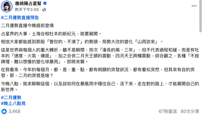 翻攝自臉書 (唐綺陽占星幫) ,下同