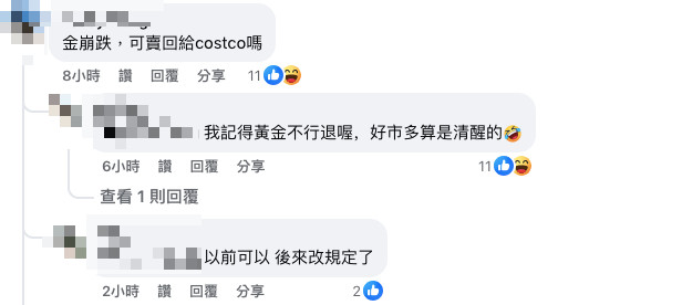 此外,也有人詢問「金崩跌,可賣回給Costco嗎?」不過,據官網指出,售出貴金屬商品之黃金、白銀、鉑金、鈀金條塊及黃金、白銀、鉑金、鈀金鑄幣 (例如:紀念幣、收藏幣) 和24K黃金金飾,皆不接受退貨。