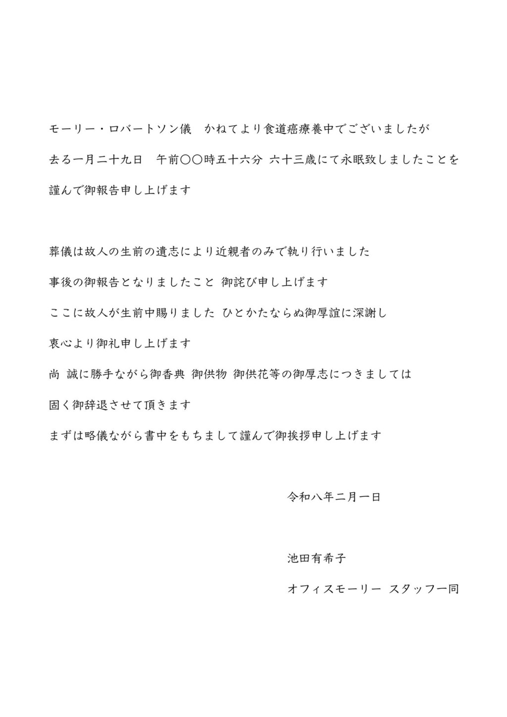 日本知名媒體人兼演員莫雷・羅伯遜 (モーリー・ロバートソン) 驚傳病逝。他所屬經紀公司「Office Morley」於2月1日透過官方社群平台發布聲明,證實莫雷於1月29日上午因罹患食道癌辭世,享壽63歲,消息一出,震驚日本演藝與媒體圈。
