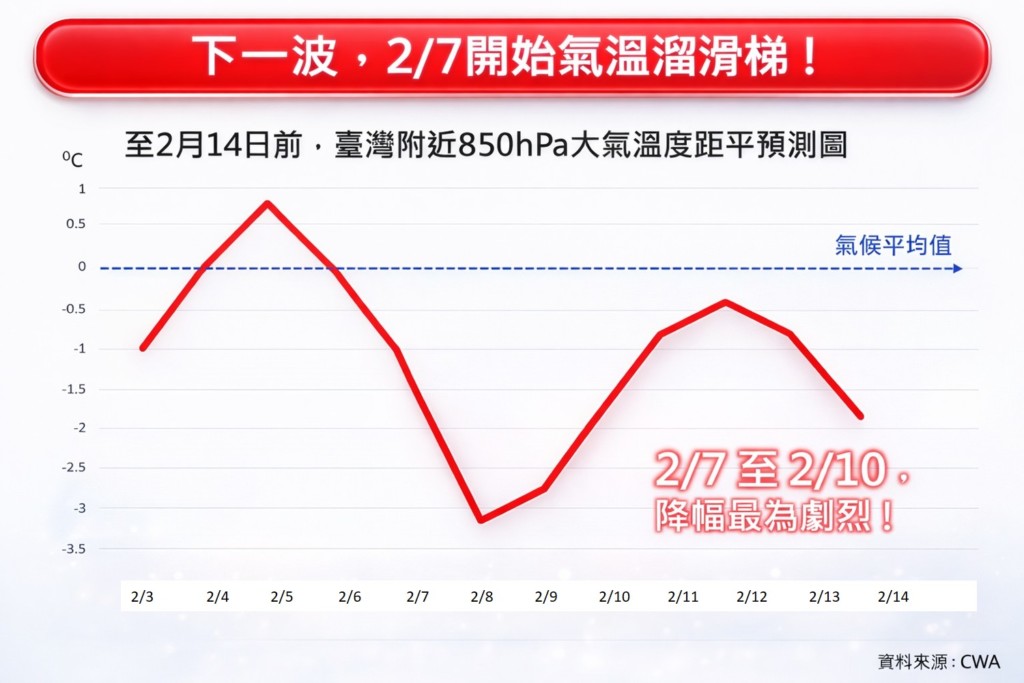 而这样的好天气将持续到周五 (6),晚间锋面及强冷空气过境,届时台湾又将变天,周六 (7) 起气温明显下滑,尤其迎风面的北部、东北部湿冷感受会特别明显。气象专家林得恩就在粉专「林老师气象站」分析表示,这波冷空气上看强烈大陆冷气团等级,甚至有机会再升等为寒流,预计将一路影响至下周二 (10)。