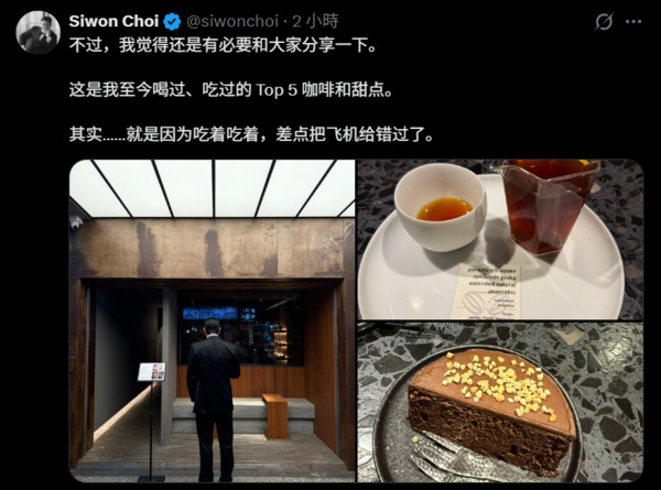 隨後,始源再度發文幽默解釋差點誤機的原因,曬出精緻蛋糕與咖啡照片笑說,「我覺得還是有必要跟大家分享,這是我至今喝過、吃過的Top 5咖啡和甜點,其實就是因為吃著吃著,差點把飛機給錯過了!」