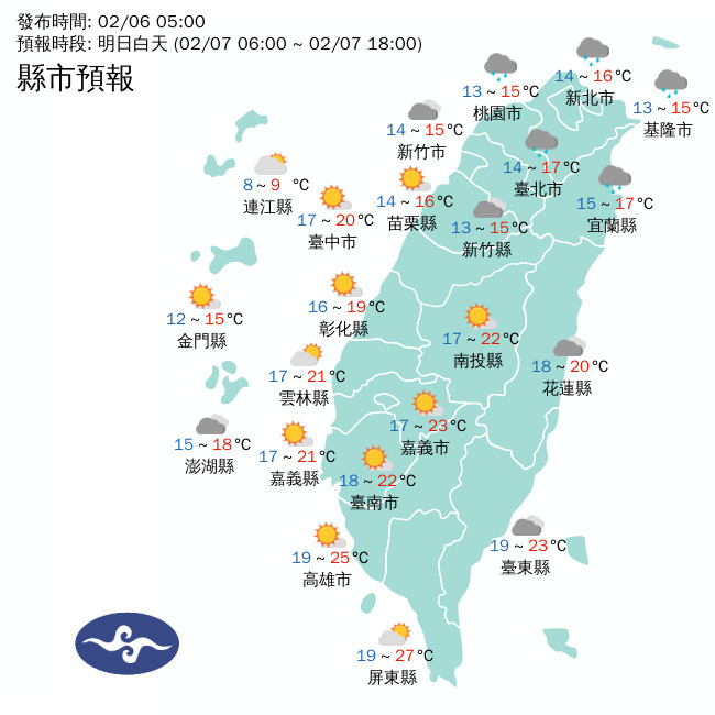 中央氣象署今天 (6) 稍早發布低溫特報,因為寒流即將抵達,明天 (7) 中部以北、東北部及東部天氣明顯轉冷,其他地區早晚亦冷;明下午起至週日 (8) 局部地區有持續10度左右或以下氣溫發生的機率,週日至下週一 (9) 清晨寒流影響,各地天氣非常寒冷。氣象專家吳德榮說明,