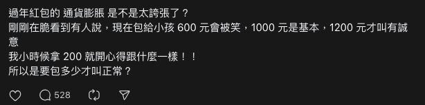 一名女網友在Threads發文表示,「過年紅包的通貨膨脹是不是太誇張了?」剛剛看到有人說「現在包給小孩600元會被笑,1,000元是基本,1,200元才叫有誠意」,自己小時候拿200元就心滿意足,「所以是要包多少才叫正常?」