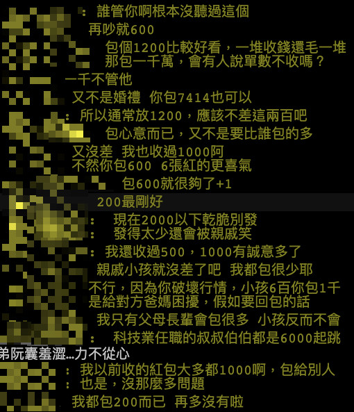 贴文曝光后,不少人纷纷表达自己看法,直言「亲戚小孩一律发200,包这么多干嘛?」、「所以通常放1200,应该不差这200吧」、「包心意而已,又不是要比谁包的多」、「包600就很够了」、「小学生以下一律200」、「国人习惯会凑1200,但若是10张100也可」。