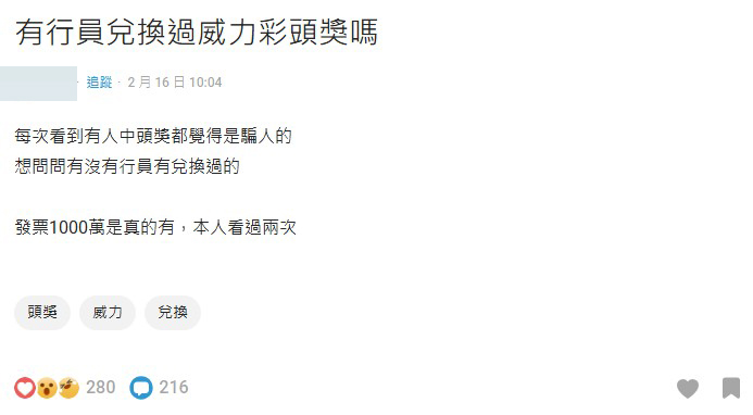 買樂透一夜致富是許多人的夢想,也有大批民眾認為彩券幾億頭獎都是假的,台彩分享中獎人的選號心路歷程時,總有網友留言批評是騙人消費的廣告。高額獎金需要向銀行預約兌領,有卡友乾脆向銀行行員喊話詢問:「有行員兌換過威力彩頭獎嗎?」結果釣出不少行員解答。