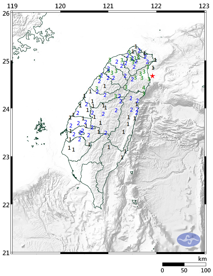 根據氣象署地震報告,宜蘭縣政府東南東方16.9公里近海發生規模5.6、深度66.8公里地震,各地最大震度如下: