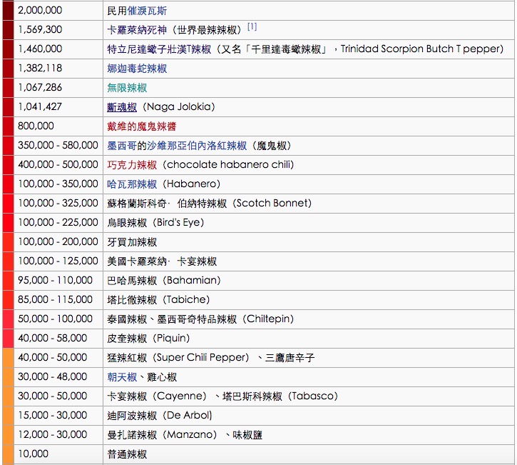 從這張用來評斷辣度的”史高維爾指標”圖中,我們可以看見在最下面是普通辣椒、而朝天椒其實也只是一開始而已…