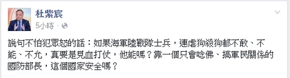 國軍吊死小白狗的事件引發群情激憤,對此,工研院知識經濟與競爭力研究中心主任杜紫宸在臉書上表示:「如果海軍陸戰隊士兵,連虐狗殺狗都不敢,真要是見血打仗,他能嗎?靠一個只會念佛、搞軍民關係的國防部長,這個國家安全嗎?看完動保團體的表演,有何感情?公開任人羞辱,軟趴趴的海軍陸戰隊,真的是大家要的嗎?」