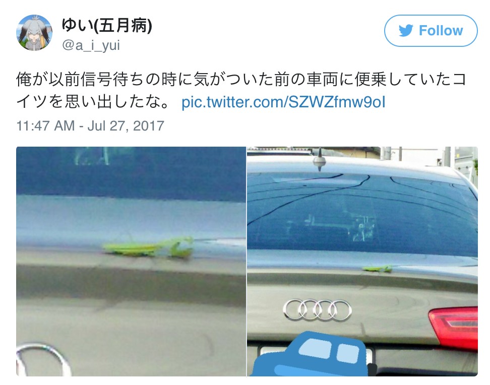谁说只有猫会报恩呢?近日在日本,有网友@gelmanes 分享自己在开车时看到一只螳螂在挡风玻璃上的惊奇影片。他当下以为螳螂会过一下就跳走,但没想到开车开一下后,这只螳螂竟然开始表演类似古典日式的舞蹈,还非常戏剧化的一直回头看。让这名网友感到非常惊奇,好像螳螂