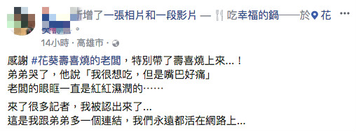 有一晚小玫听到弟弟在说梦话提到「花葵」,想到弟弟很喜欢那家店的味道,还有全家人一起去用餐的回忆,原本答应过要再一起去,但现在来不及「这是我最大的遗憾」。老板游子轩16日搭高铁到台北,在小玫家中煮好时才送到病房,一看到患者在床上忍不住哭了。小玫在脸书发文说,感谢花葵寿喜烧的老板特地带寿喜烧上来,老板的眼眶一直是红红湿润的;弟弟哭了,他说「我很想吃,但是嘴巴好痛。」