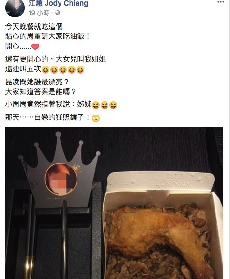 江蕙25日日在脸书上发文表示,「贴心的周董请大家吃油饭!」另外还开心地说小周周一连叫了她5次的姐姐,而且当昆凌问说:「谁最漂亮?」小周周竟然指著江蕙说「姐姐!」、「那晚,自恋的一直照镜子!」许多网友看到小周周跟江蕙的对话后,纷纷留言表示,「小周周太嘴甜了!」、「爸妈教得太好!」、「二姐当然最美。」、「小周周很懂事!」也有人想起周董当时在演唱会被江蕙吐槽时,开玩笑将送800盒油饭,「如今终于兑现!」