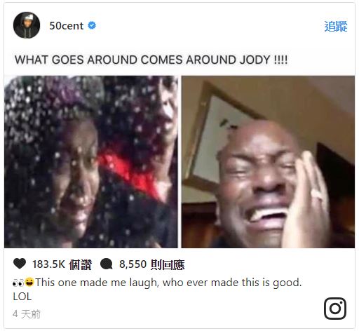 饒舌歌手5角 (50 Cent) 選擇對泰瑞斯落井下石,PO文取笑泰瑞斯:「出來混,遲早是要還的」。