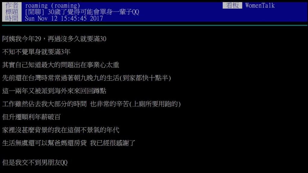 她表示,「我今年29,再過沒多久就要滿30,不知不覺單身就要滿3年。其實自己知道最大的問題出在事業心太重,先前還在台灣時常常過著朝九晚九的生活 (到家都快十點半),這一兩年又被派到海外來來回回蹲點。工作雖然佔去我大部分的時間 也非常的辛苦 (上廁所要用跑的),但升遷順利年薪破百,家裡沒甚麼背景的我在這個不景氣的年代,生活無虞還可以幫爸媽還房貸,我已經很感謝了。」