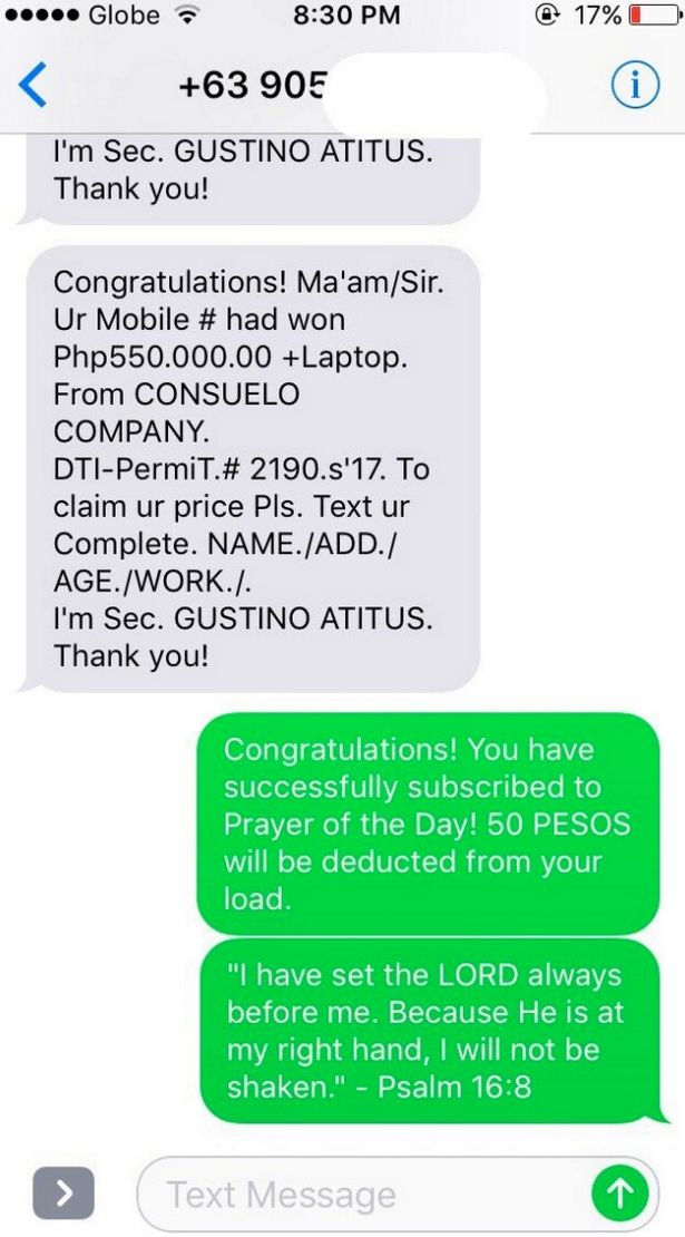国外网友夏纳 (Shaina Gimao) 最近收到一则讯息说她中了大奖:「我是Sec. Gustino Atitus。谢谢你!恭喜你中奖!你的手机号码中了Php550.000.00+笔电,来自Consuelo公司。回复你的完整姓名/住址/年龄/工作即能领奖。谢谢!」