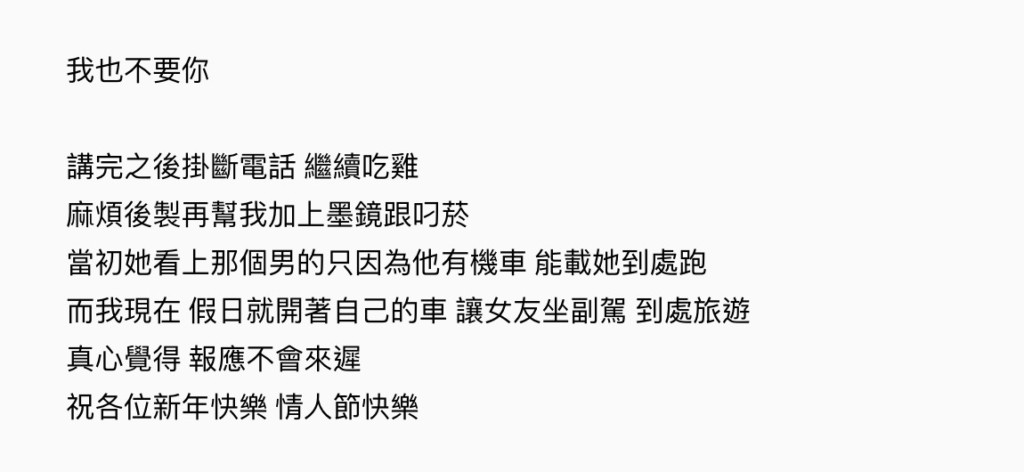 原PO說:「沒事的,就算他不要你,還有我…」當大家都以為是要安慰前女友的時候,他回了一句超打臉的話!他說:「我也不要你」然後就掛斷電話回去玩吃雞。最後解釋當初因為前女友看上別人有機車能帶她到處跑,所以離開了原PO,現在原PO有車了,帶女友到處旅遊。最後說:「真心覺得 報應不會來遲,祝各位新年快樂 情人節快樂」。