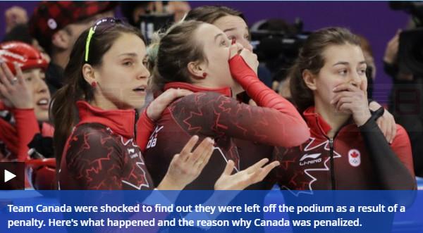 這屆平昌冬奧爭議不斷,女子3000公尺接力賽中,中、加、韓3隊原本都有領先,結果南韓隊在倒數第五圈時發生嚴重的失誤,不僅選手自殺,還推倒旁邊的加拿大選手,賽後被推倒的加拿大選手卻被判違規喪失比賽資格,隊員知道之後露出不敢置信的表情;而在1500公尺速滑半決賽加拿大選手被韓國選手推倒,結果也是加拿大選手被判犯規,看來這次冬奧兩隊結下的樑子可不小。