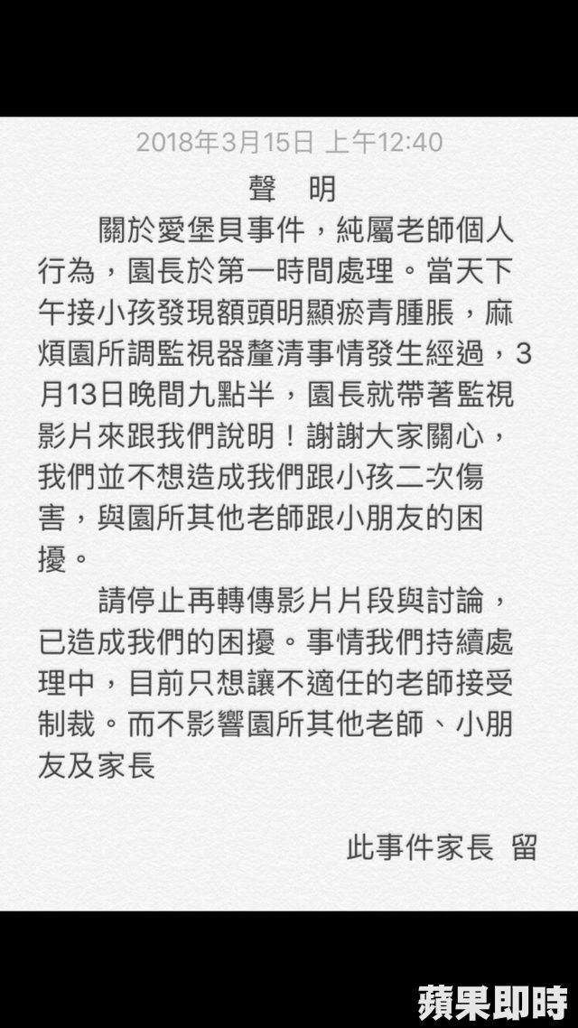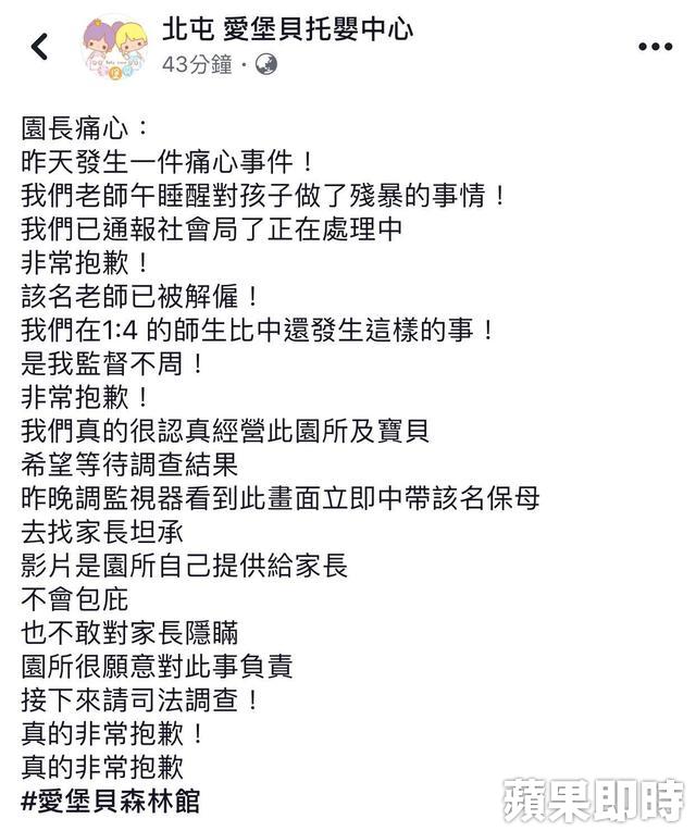 对此,托婴中心园长赶紧发声明,除了道歉,也已通报社会局,目前这位保母也遭解雇了,也提到影片是园所提供,所以绝无包庇行为,「我们在1:4的师生比中还发生这样的事,是我监督不周!非常抱歉!我们真的很认真经营此园所,等待调查结果出炉,很愿意对此事负责!接下来请司法调查!真的非常抱歉!真的非常抱歉。」