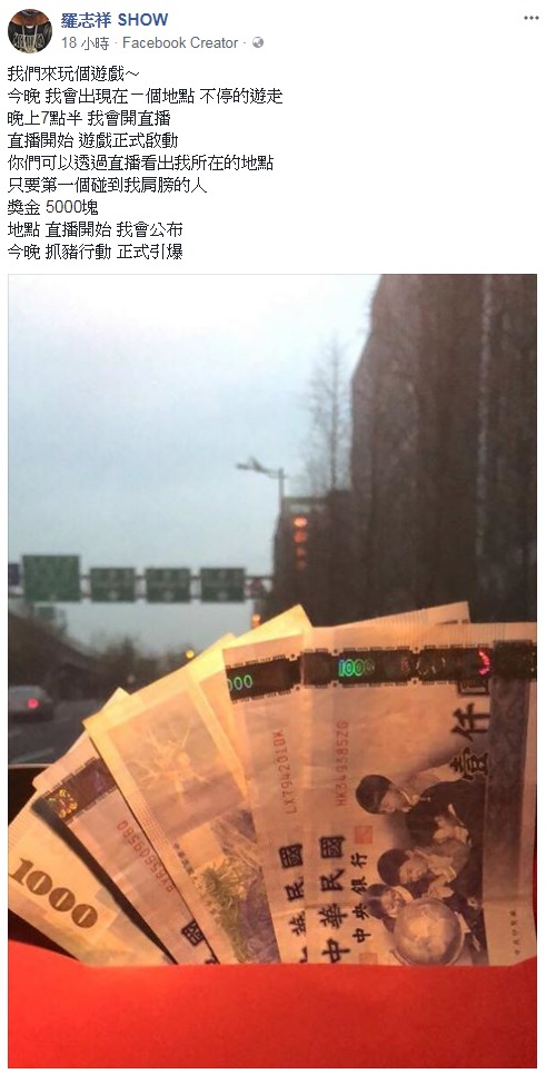 藝人羅志祥時常會在臉書上和粉絲們互動,18日時他突然在臉書預告將要來個「抓豬行動」,表示自己將會在某個地方行走,粉絲們可以透過直播畫面來判斷他身在何處,第一位發現到他並且拍到他肩膀的人,將可以獲得獎金5000元,結果沒想到才開始沒多久,他馬上就被抓到,讓他直呼太扯,只好再加碼。