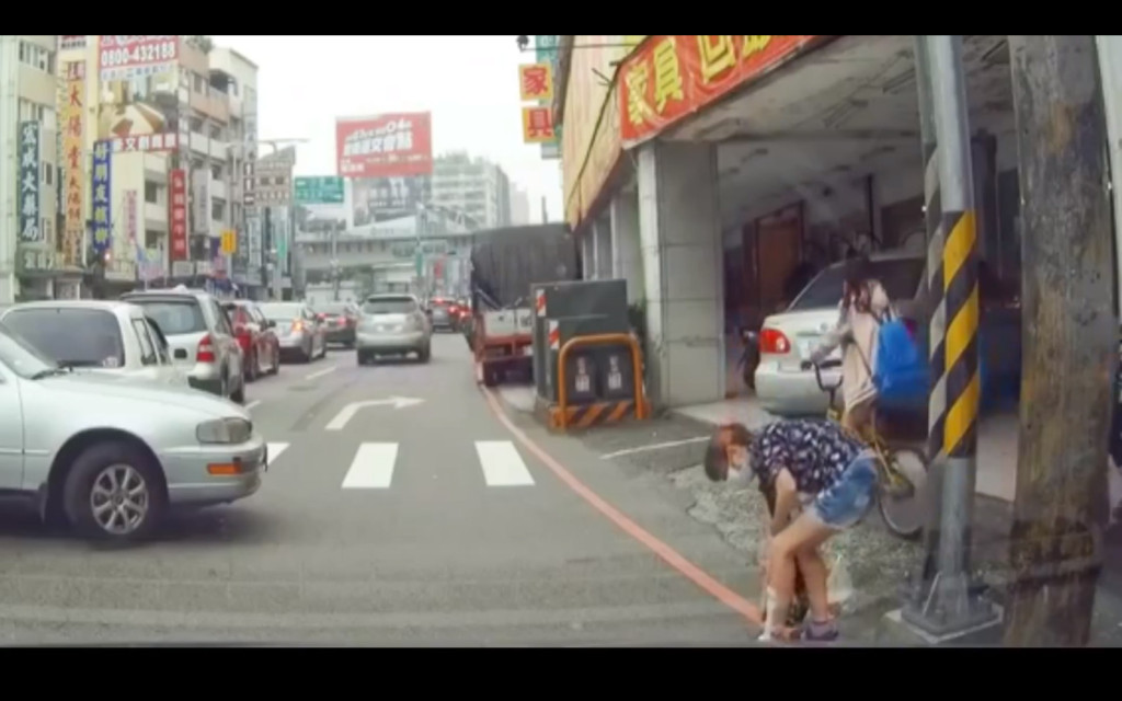 該名女子疑似因為騎樓有車子擋住去路,因此選擇走到馬路邊邊,而後方的車輛則是為了閃避迴轉車子,慢慢地往右邊行駛。只是轎車司機疑似沒注意到已經太過貼近女子,就這樣輾過女子原先就已經受傷的左腳。