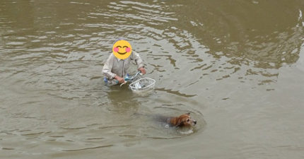 暴雨淹到腰!阿公堅持「水中騎車」遛狗 網笑:根本在游泳