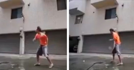 颱風天不孤單!他跟狂風對打羽毛球 「私人教練」扣殺球:回去練練吧~