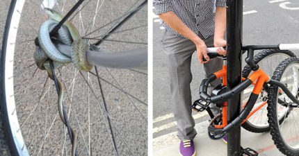 腳踏車輪胎遭勾勾纏!牽車驚見「蛇頭鎖」嚇傻:請問…這鎖該怎麼解…