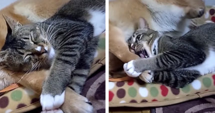 抓「男友手」呼嚕嚕大睡 柴犬麻到怒抽離「貓皇天崩地裂」