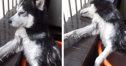 月月被泡進桶子「好好洗澡」 主人安撫不聽當場厭倦狗生:隨便你吧~
