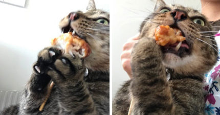 偷吃炸雞被抓包!喵咪卯起勁來「往嘴裡硬塞」:朕也要吃雞呀~