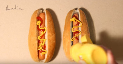 他把番茄醬和芥末醬用在熱狗上面,接下來他一刀砍下去時你的下巴就會掉下來了…