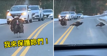 開車遇到火雞集體過馬路 巨大身影「超紳士幫火雞妹擋車」連駕駛也被迷倒:火雞界大仁哥!